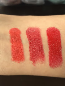 | From left to right (daylight) MAC 'Lady Danger', Chanel 'Passion', YSL 'Red Muse' |