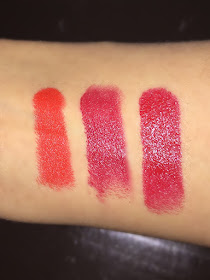 | From left to right (with flash) MAC 'Lady Danger', Chanel 'Passion', YSL 'Red Muse' |